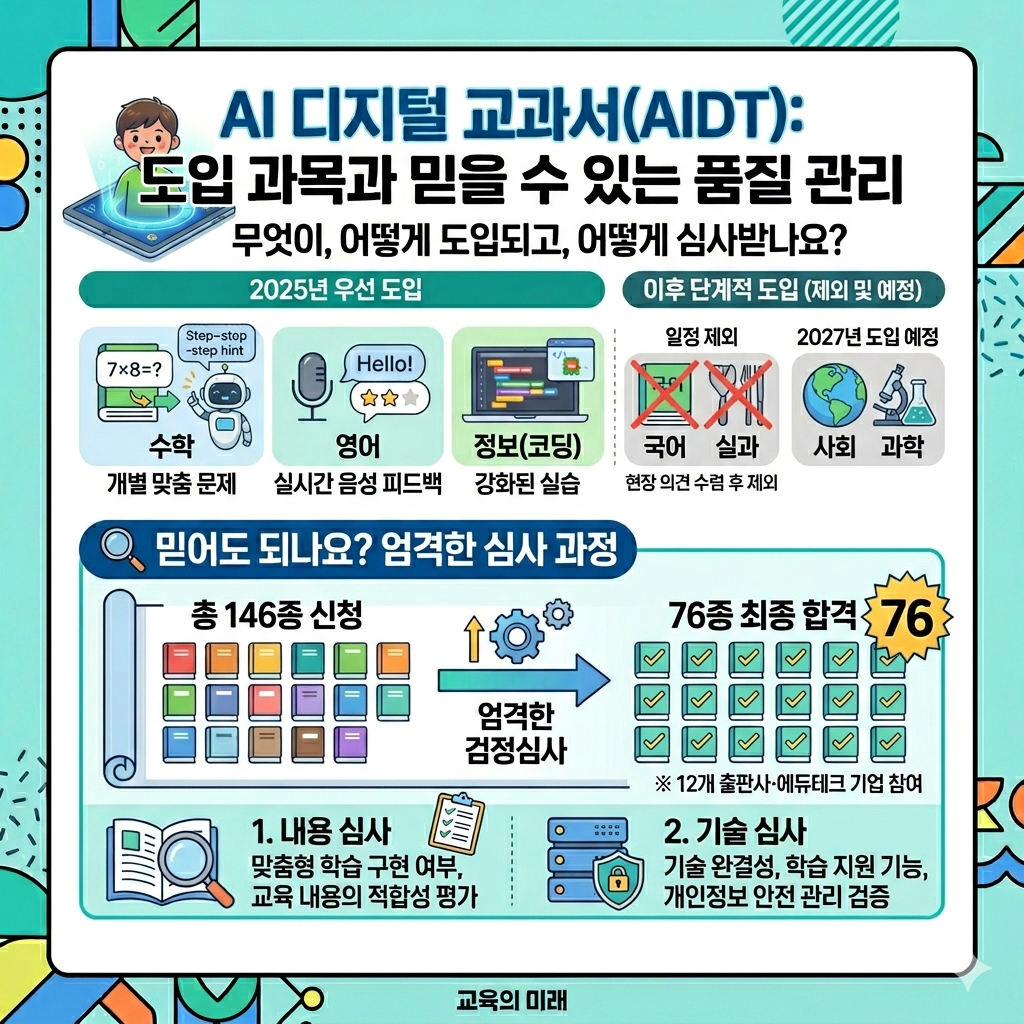 심사는 크게 두 가지로 이루어집니다. 첫째는 내용심사로, 맞춤형 학습 구현 여부와 교육 내용의 적합성을 평가합니다. 둘째는 기술심사로, 기술 완결성과 학습 지원 기능, 그리고 개인정보 안전 관리 여부까지 꼼꼼히 따집니다. 12개 출판사·에듀테크 기업의 76종이 이 심사를 통과해 현재 각 학교가 선택·사용 중입니다.
